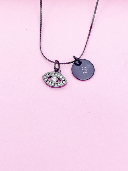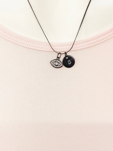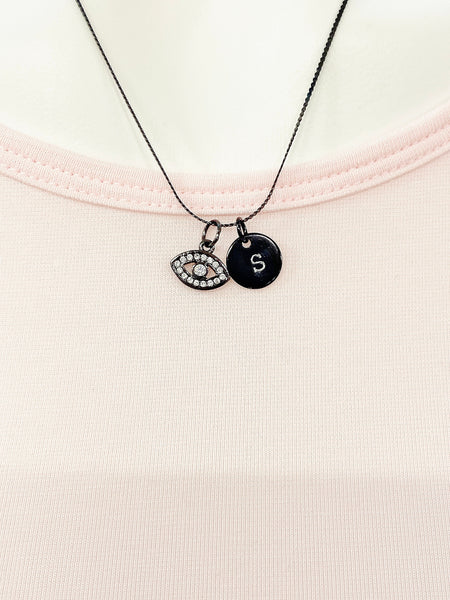 This is black tone CZ Brass Micro Pave Cubic Zirconia Evil Eye charm with hand stamped initial charm on brass/stainless steel 18 inches chain.
