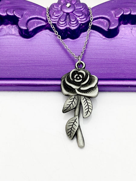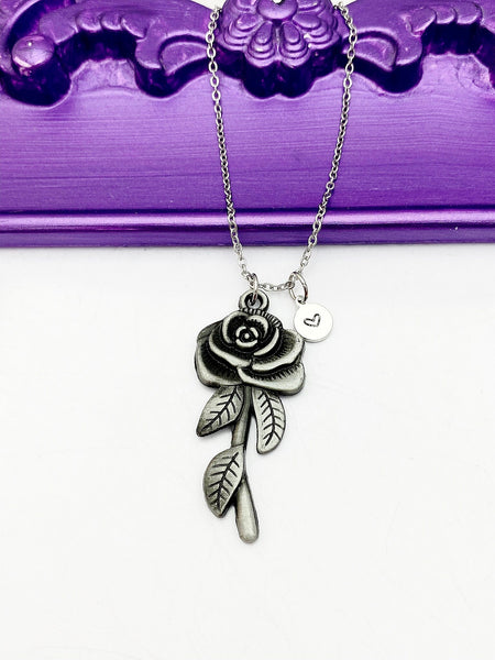 This is a rose charm with hand stamped initial charm on a stainless-steel chain.