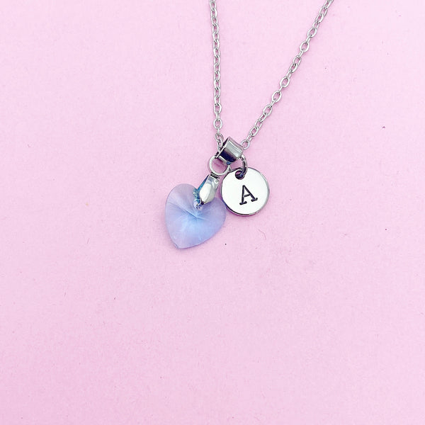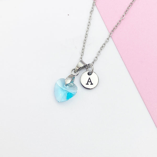 This is a silver-tone glass blue aquamarine heart charm with hand stamped initial charm on stainless steel necklace.