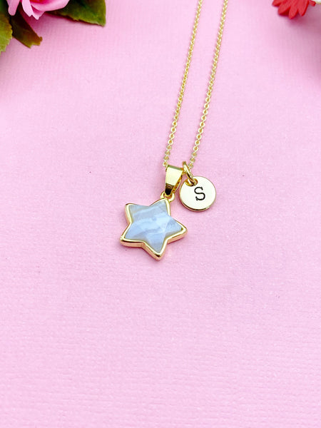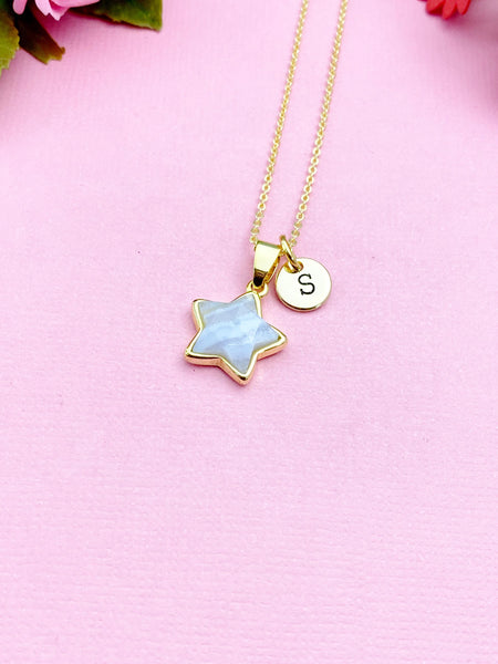 This is gold tone Natural Blue Lace Agate charm with hand stamped initial charm on brass or stainless-steel chain.