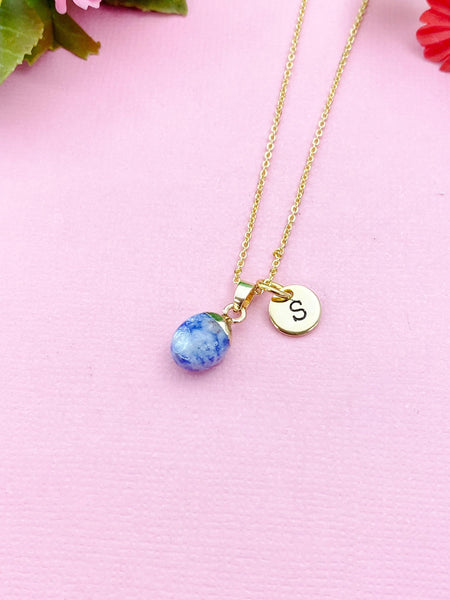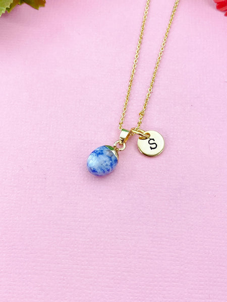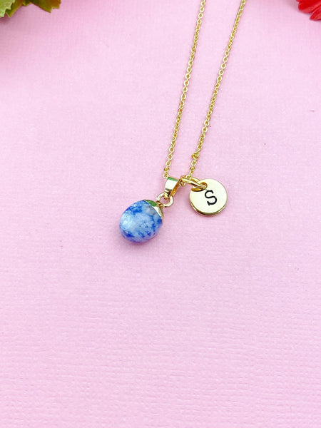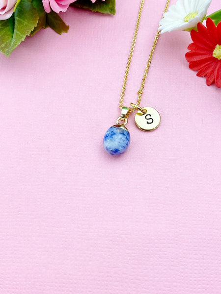 This is a gold-tone Blue Spot Jasper charm with hand stamped initial charm on brass/stainless steel 18 inches chain.