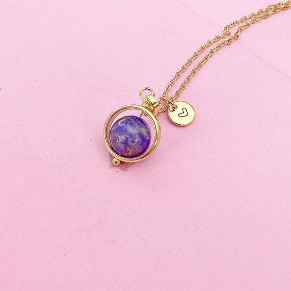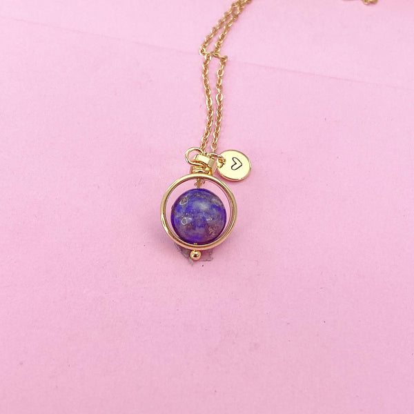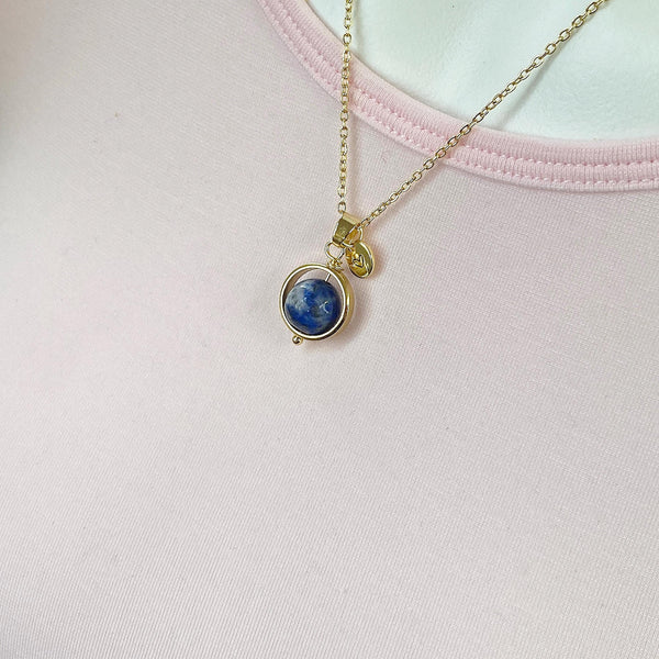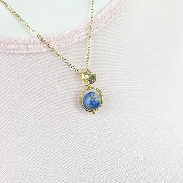 This is a gold-tone Natural Blue Spot Jasper charm with hand stamped initial charm on brass or stainless-steel chain.