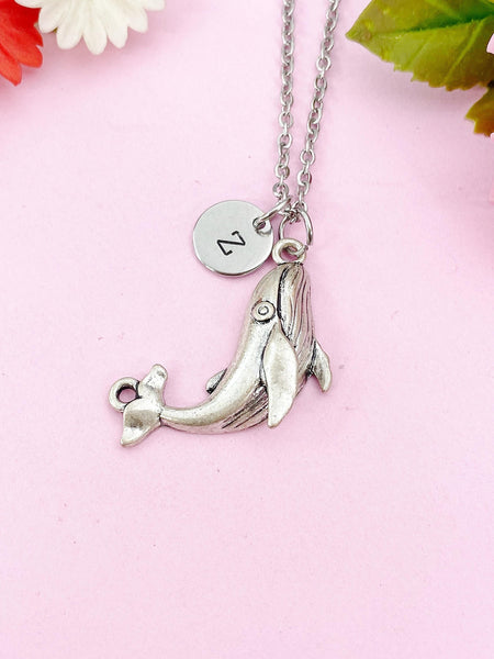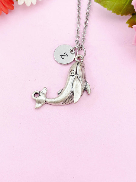 This is a silver tone Whale charm with hand stamped initial charm on brass/stainless steel chain.