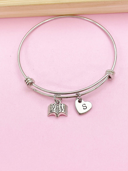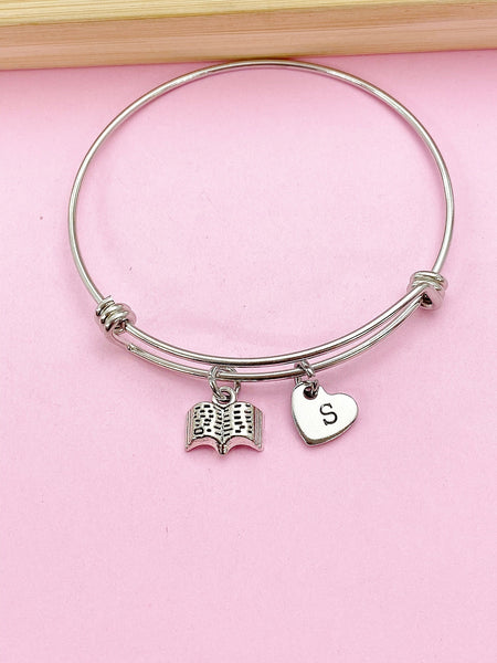 This is a silver-tone Open Book charm with hand stamped initial charm on stainless steel bracelet.