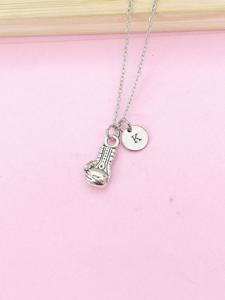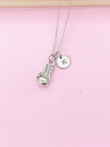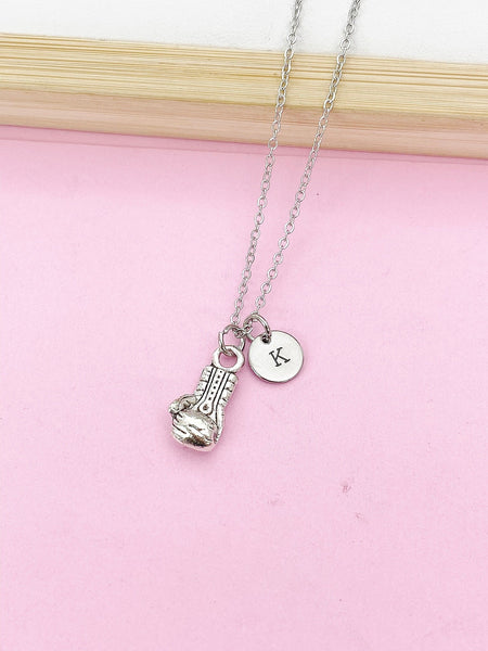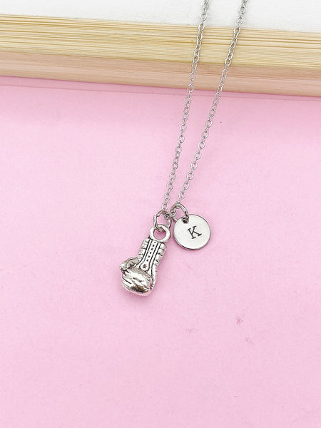This is a silver-tone Boxing Gloves charm with hand stamped initial charm on stainless steel necklace.