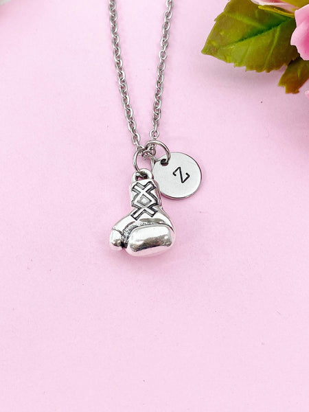 This is a silver tone boxing glove charm with hand stamped initial charm on brass/stainless steel chain.