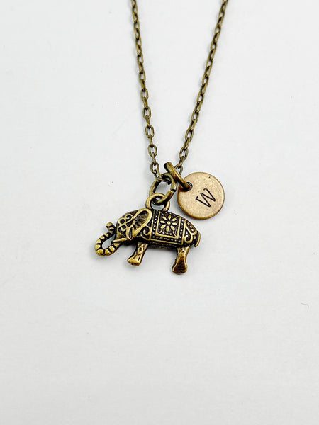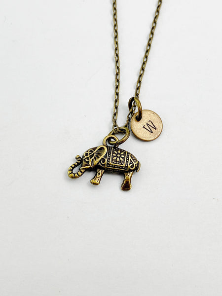This is a bronze -tone Elephant charm with hand stamped initial charm on brass or stainless steel 18 inches chain.