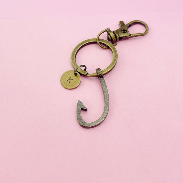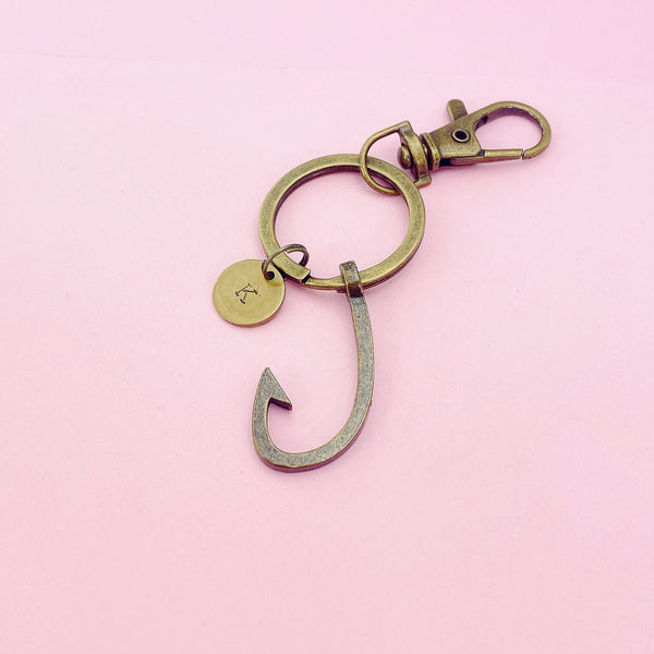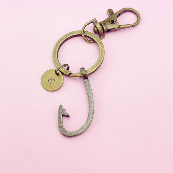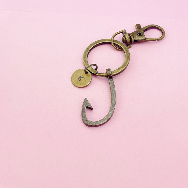 This is an antique bronze-tone fishhook charms with hand stamp initial on keyring.