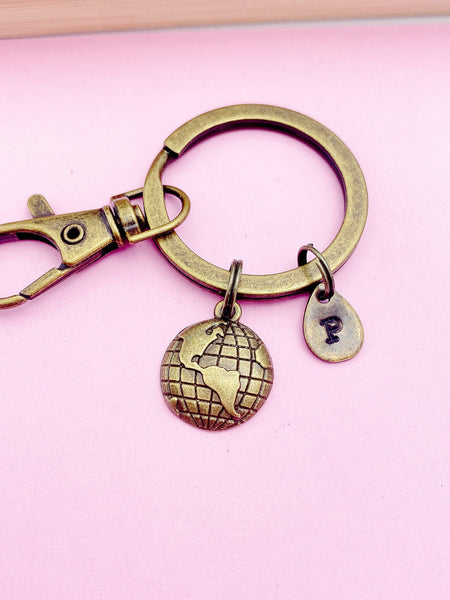 This is a silver or bronze-tone globe charm with hand stamped initial charm on keyring.