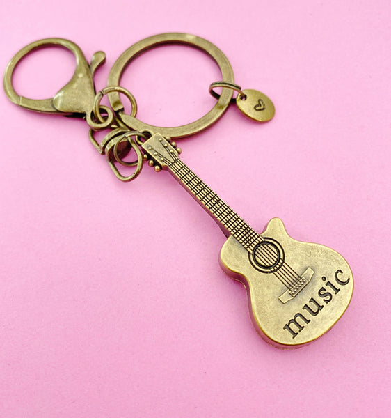 This is a bronze -tone guitar charm with hand stamped initial charm on keyring.
