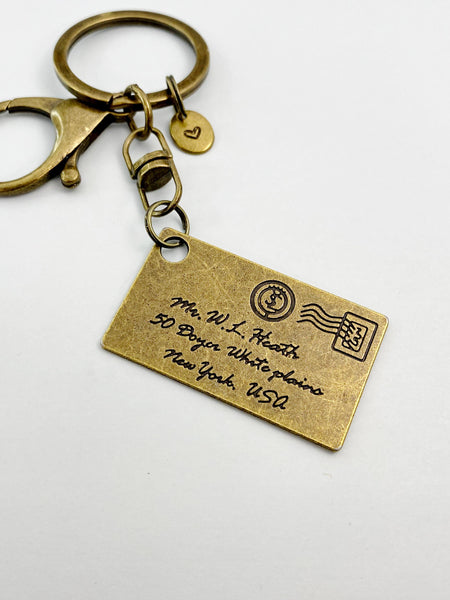This is a bronze -tone mail charm with hand stamped initial charm on keyring.