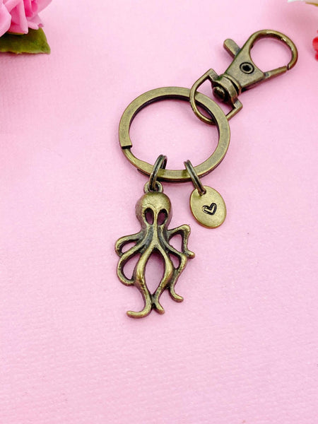 This is a silver or bronze-tone octopus' charm with hand stamped initial charm on keyring.