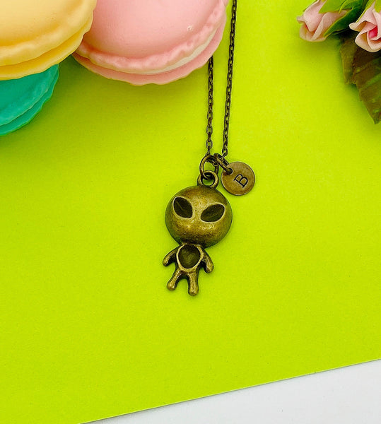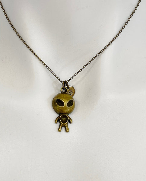 This is silver tone alien charm with hand stamped initial charm on brass/stainless steel 18 inches chain.