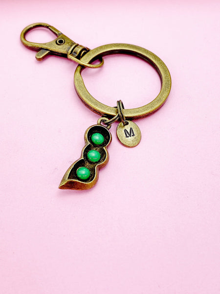 This is a bronze pea charm with hand stamped initial charm on keyring.