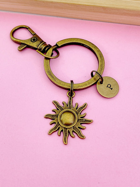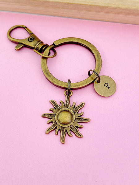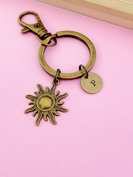 This is a silver or bronze-tone sun charm with hand stamped initial charm on keyring.
