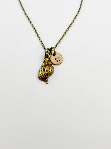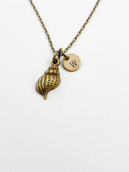 This is a bronze -tone Sea Snail Shell charm with hand stamped initial charm on brass or stainless steel 18 inches chain.