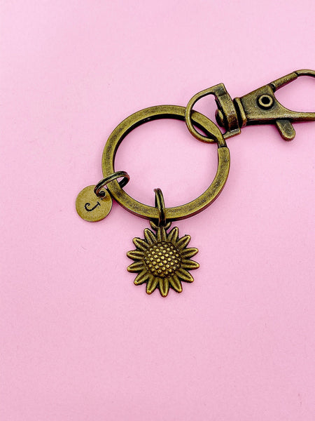 This is a bronze-tone sunflower charm with hand stamped initial charm on keyring.