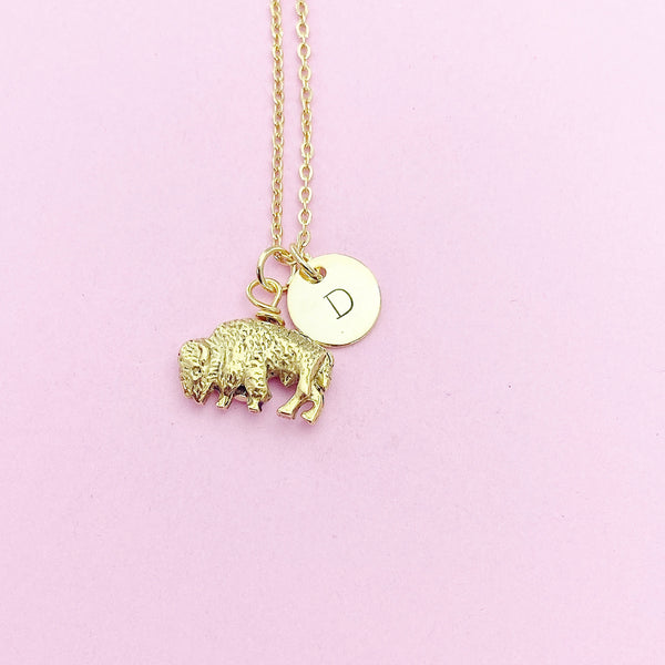 This is a gold or silver-tone buffalo charm with hand stamped initial charm on necklace.