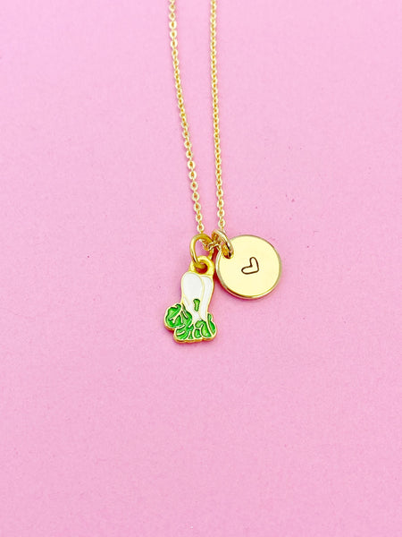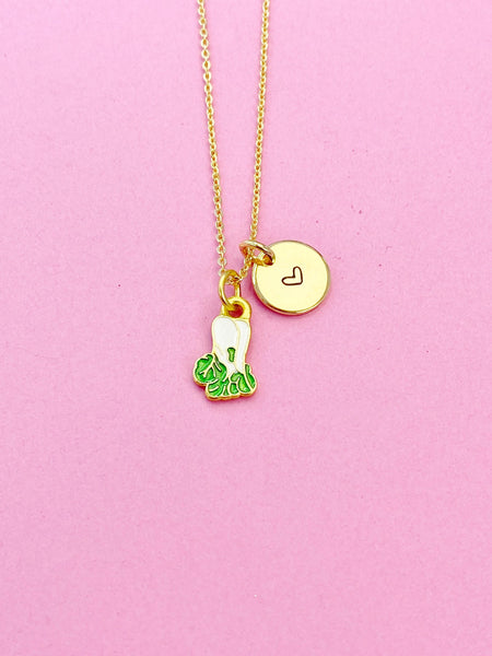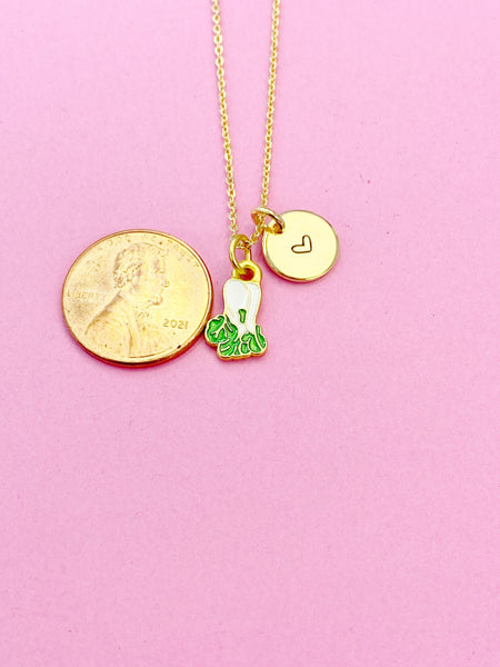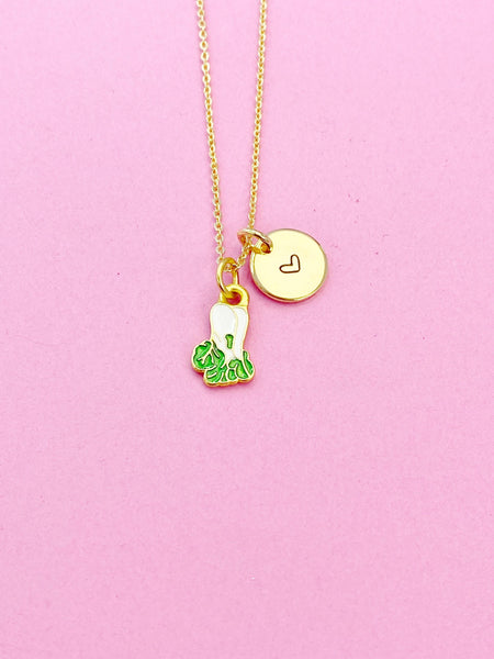 This is a gold -tone Chinese Cabbage charm with hand stamped initial charm on brass/stainless steel 18 inches chain.