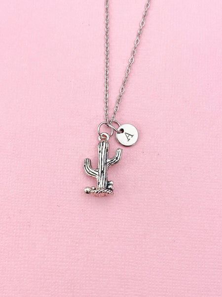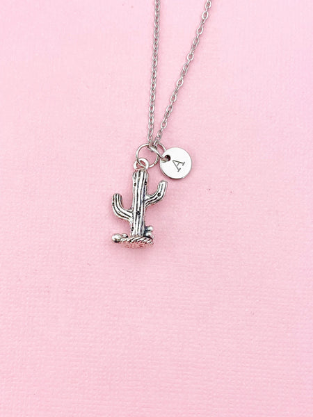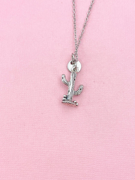 This is a silver -tone Cactus charm with hand stamped initial charm on brass/stainless steel 18 inches chain or bracelet or keyring.