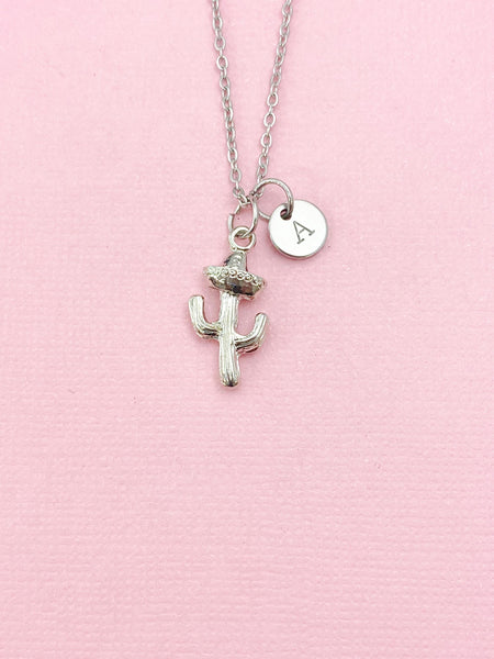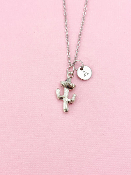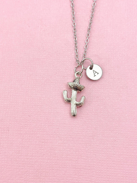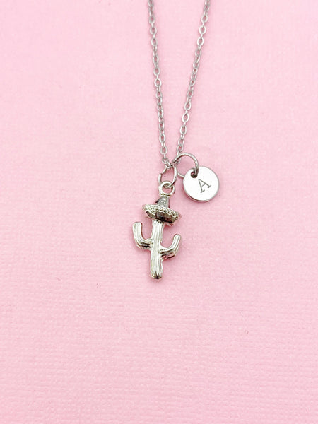 This is a silver -tone Cactus charm with hand stamped initial charm on brass/stainless steel 18 inches chain or bracelet or keyring.
