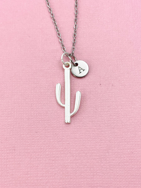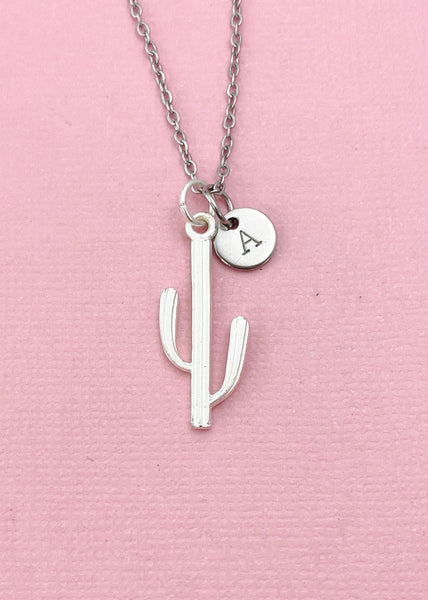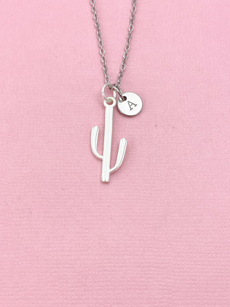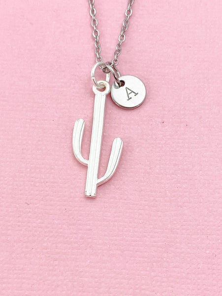 This is a silver -tone Cactus charm with hand stamped initial charm on brass/stainless steel 18 inches chain or bracelet or keyring.