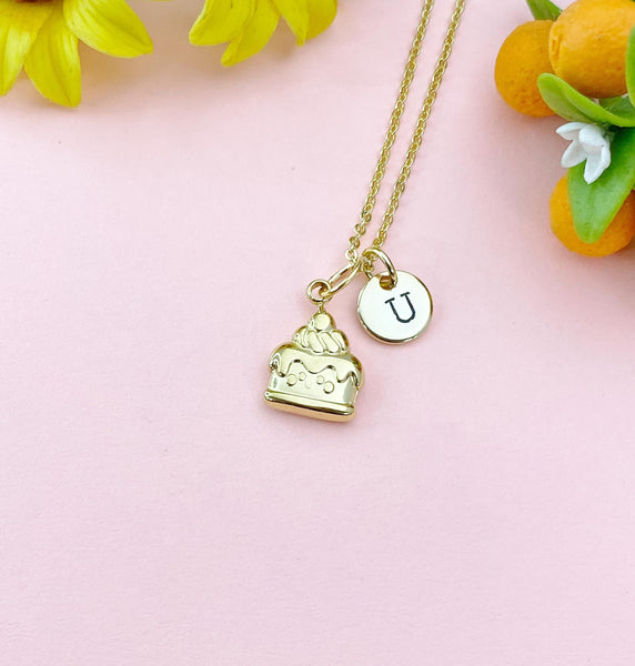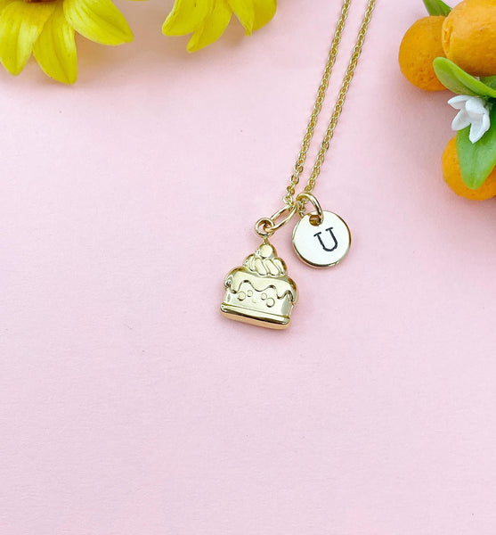 This is a gold -tone cake charm with hand stamped initial charm on brass/stainless steel 18 inches chain or bracelet or keyring.