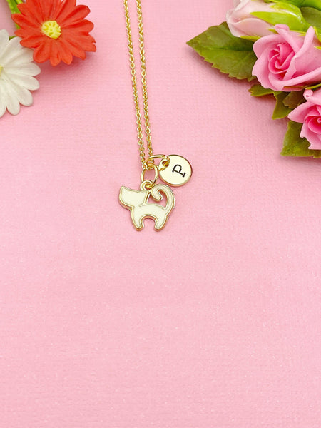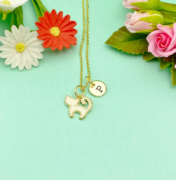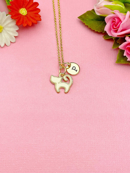 This is a gold tone cat charm with hand stamped initial charm on brass/stainless steel 18 inches chain.
