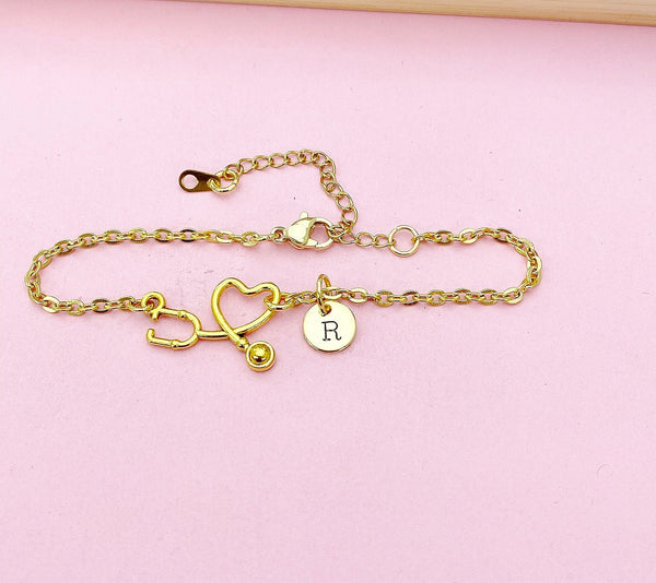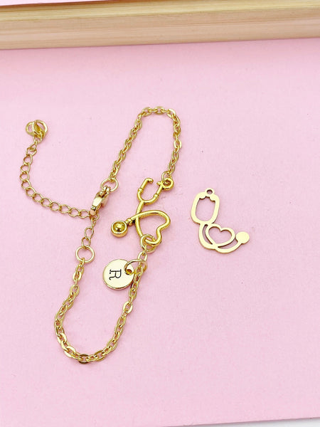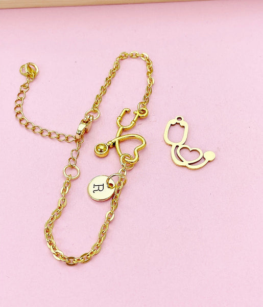 This is a gold -tone alloy or stainless-steel Stethoscope charm with hand stamped initial charm on stainless steel chain.