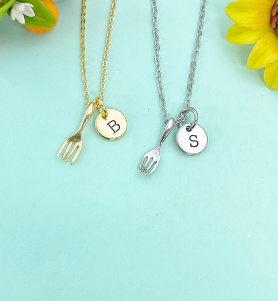 This is a gold or silver-tone fork charm with hand stamped initial charm on necklace.