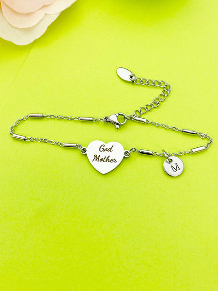 This is an engraving Godmother on stainless steel with hand stamp Initial charm on stainless-steel bracelet.