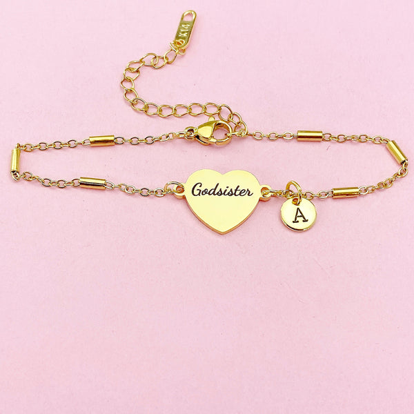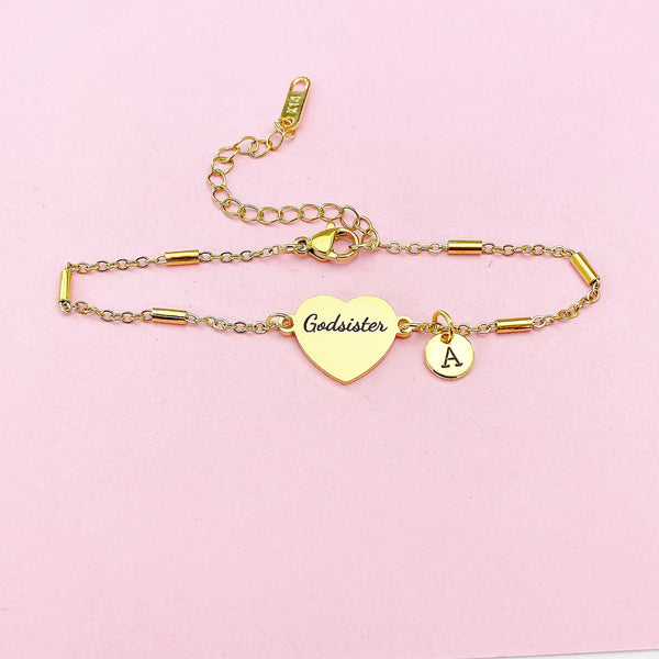 This is an engraving Godsister on stainless steel with hand stamp Initial charm on stainless-steel bracelet.