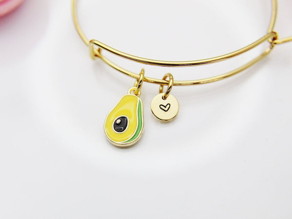 This is a gold-tone avocado charm with hand stamped initial charm on stainless steel bracelet.