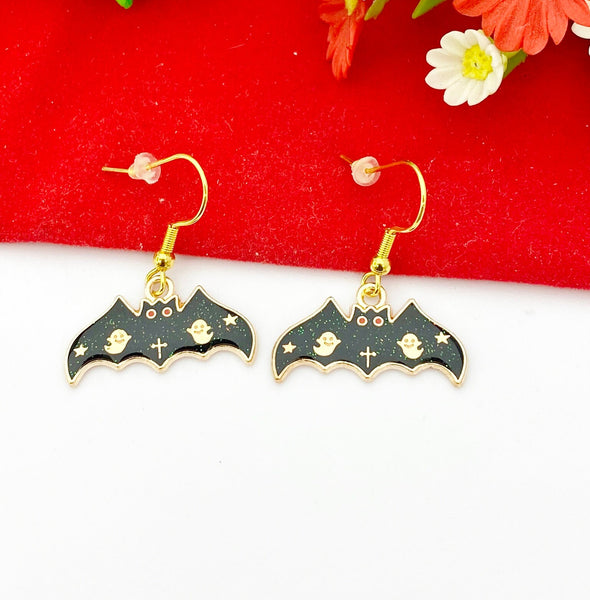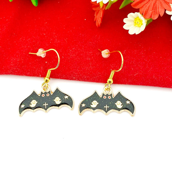 These are gold-toned Bat with Ghost charm on stainless steel ear hooks.