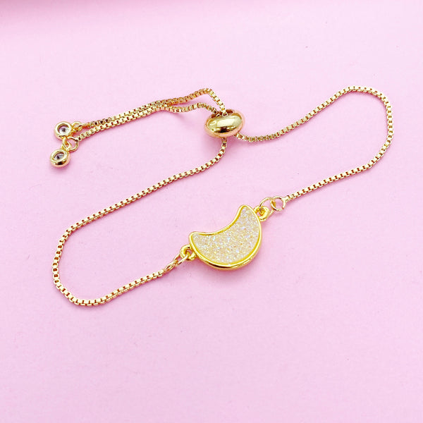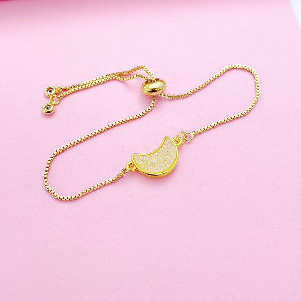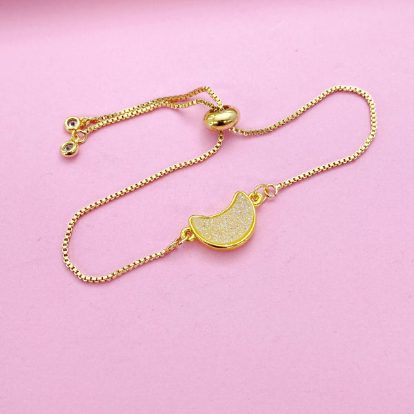 This is a gold-tone moon charm with hand stamped initial charm on bracelet.
