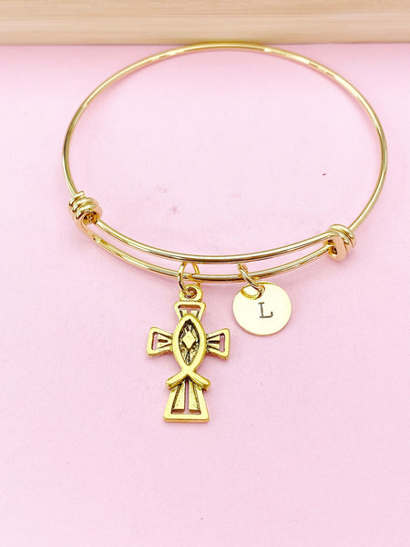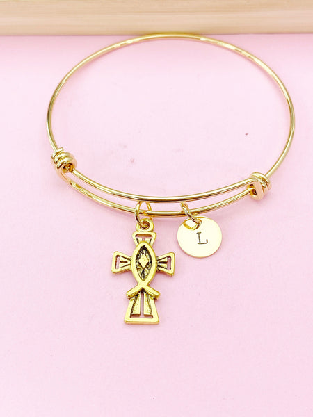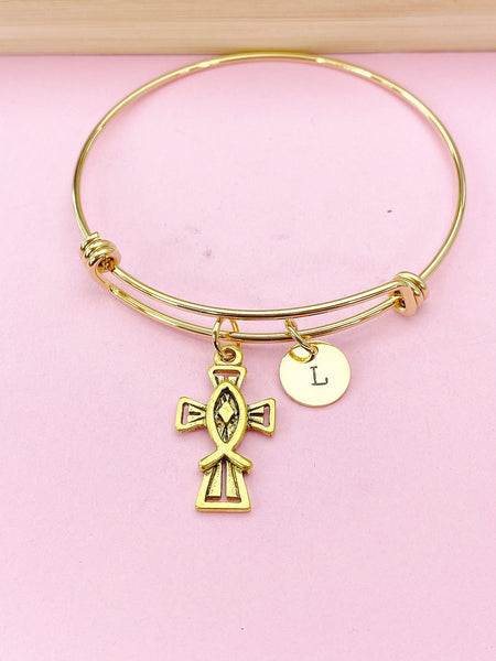 This is a silver-tone Crucifix Cross with Jesus Fish charm with hand stamped initial charm on stainless steel bracelet.
