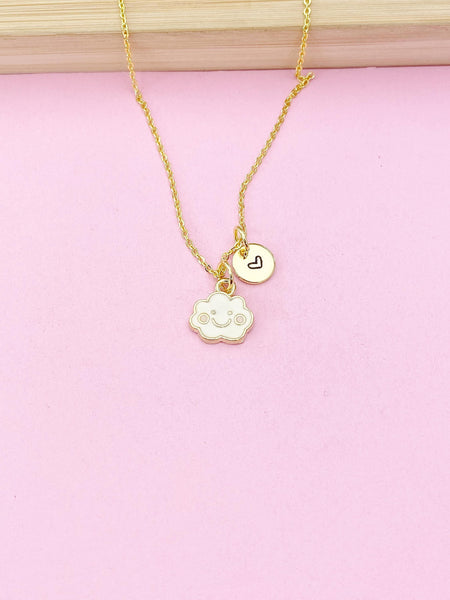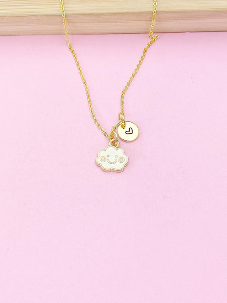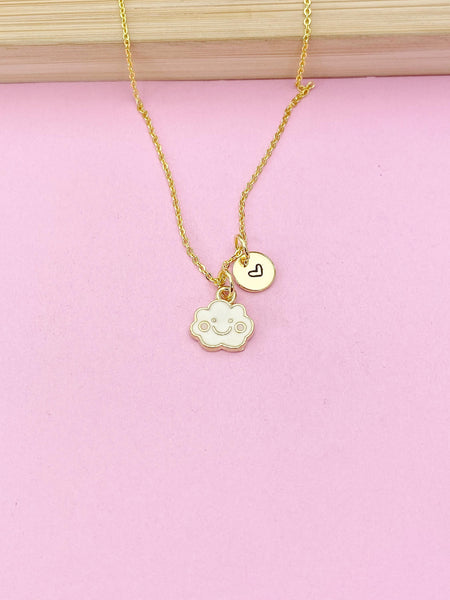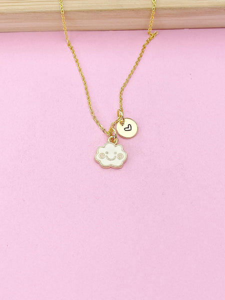 This is gold tone cloud charm with hand stamped initial charm on brass or stainless-steel chain.
