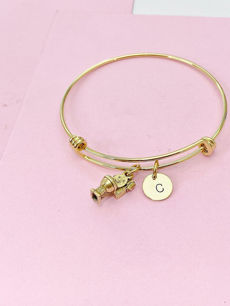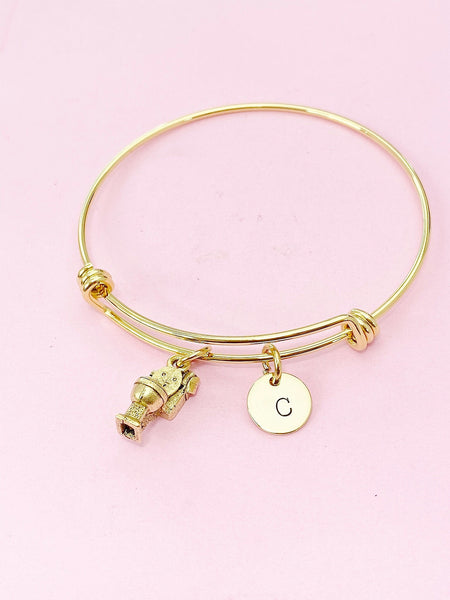 This is a gold -tone cute toilet harm with hand stamped initial charm on stainless steel bracelet.