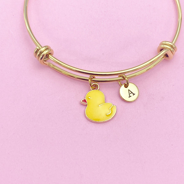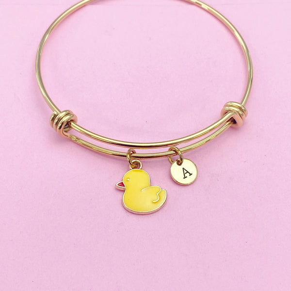 This is gold tone Cute Yellow Duckling charm with hand stamped initial charm on brass or stainless-steel bracelet.