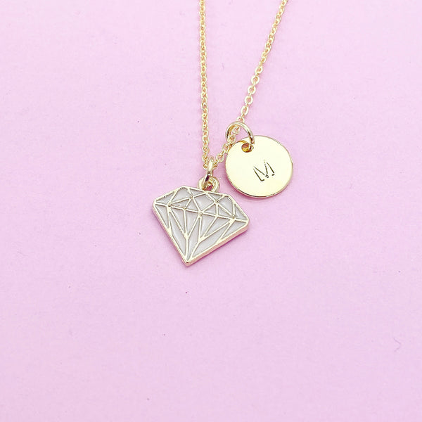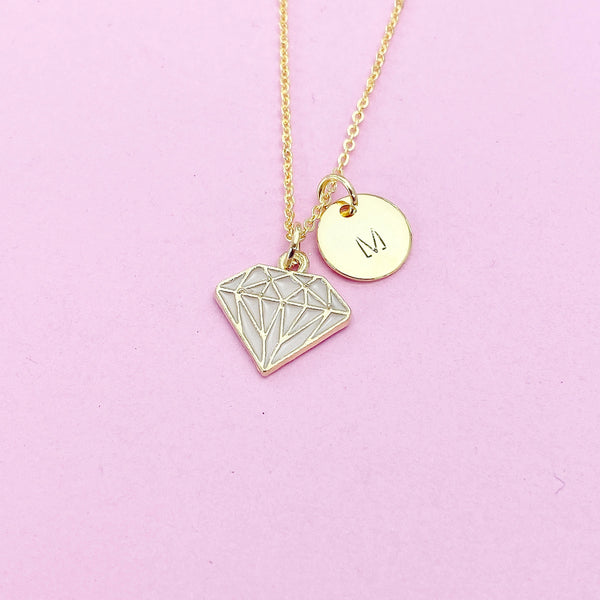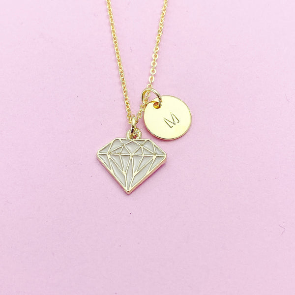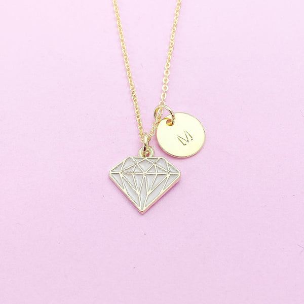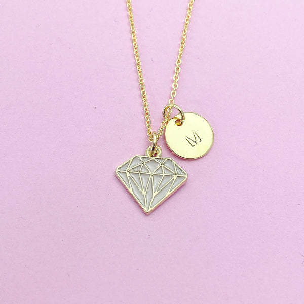 This is a gold-tone diamond charm with hand stamped initial charm on brass or stainless-steel chain.