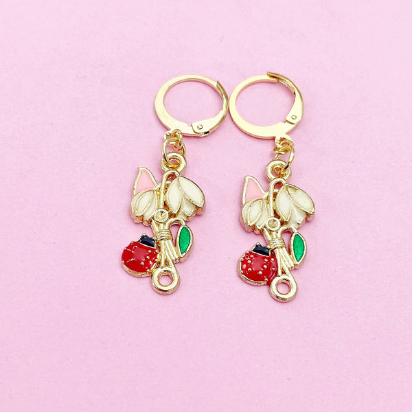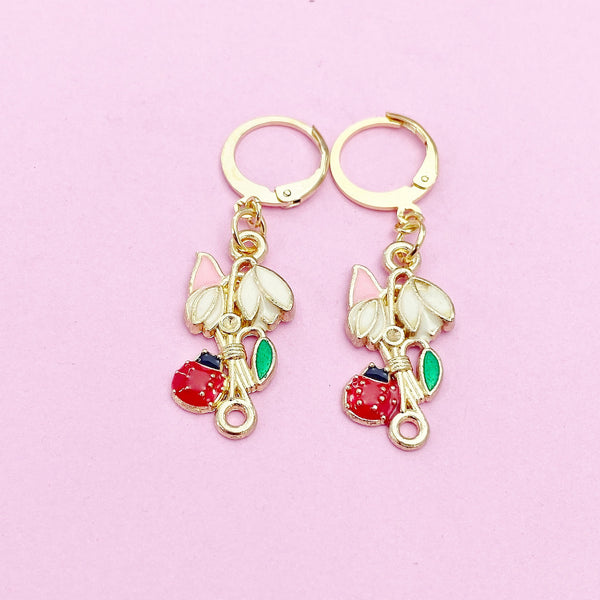 Gold Flower with Red Ladybug Charm Earrings, Pink White Green Flower with Red Ladybug Charm, N2693