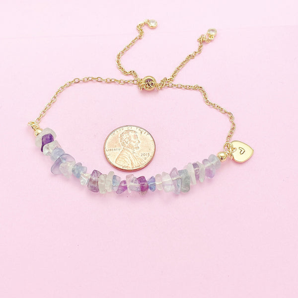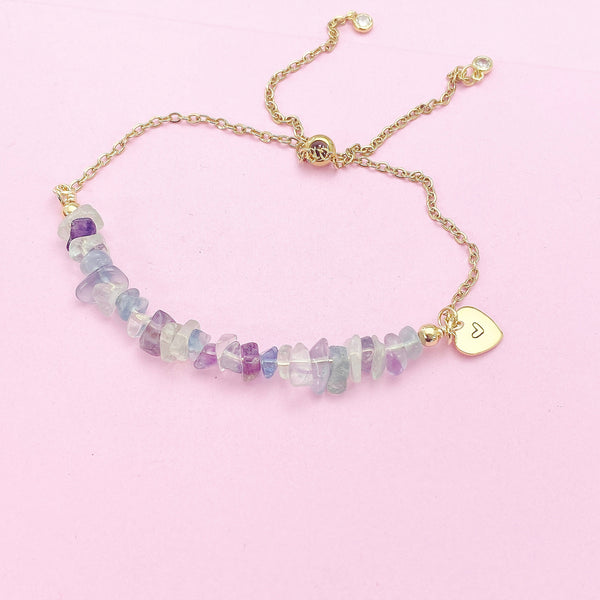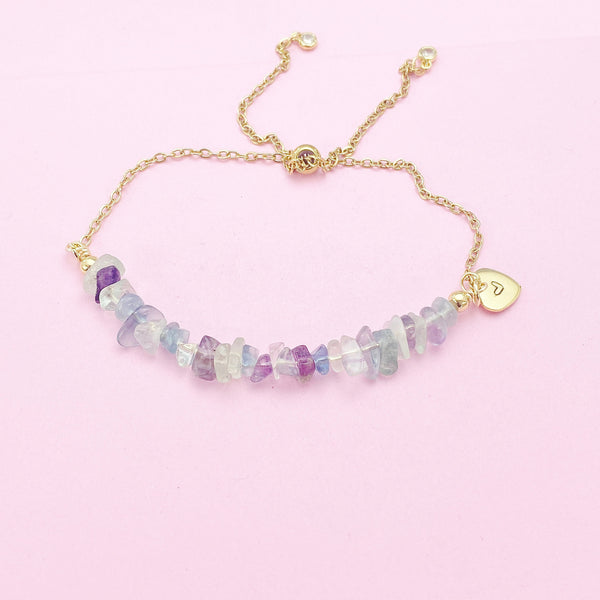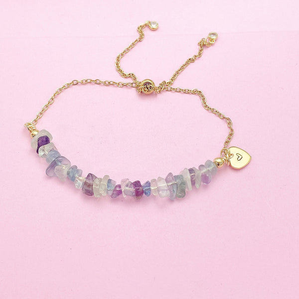 This is Natural Fluorite charm with hand stamped initial charm on steel bracelet chain.