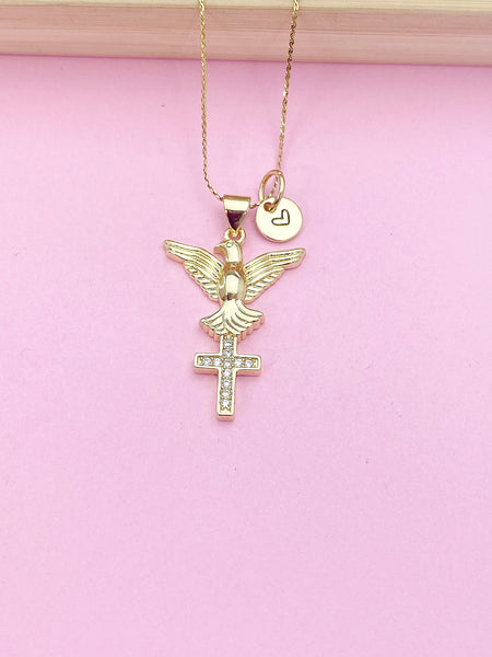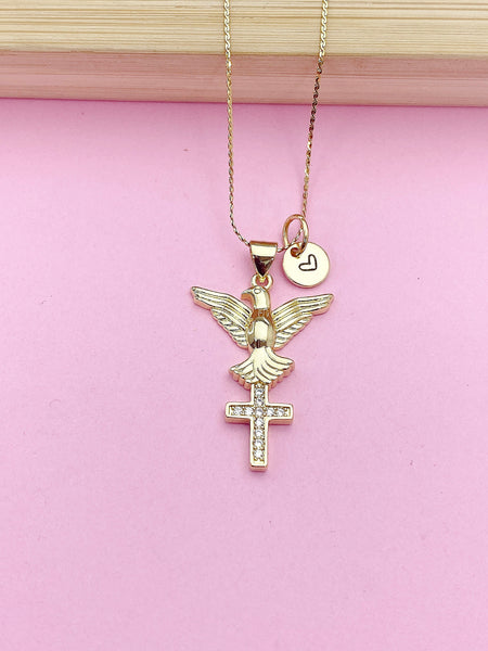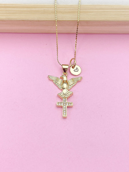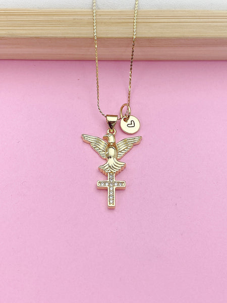This is gold tone Holy Spirit Dove Cross charm with hand stamped initial charm on brass/stainless steel 18 inches chain.