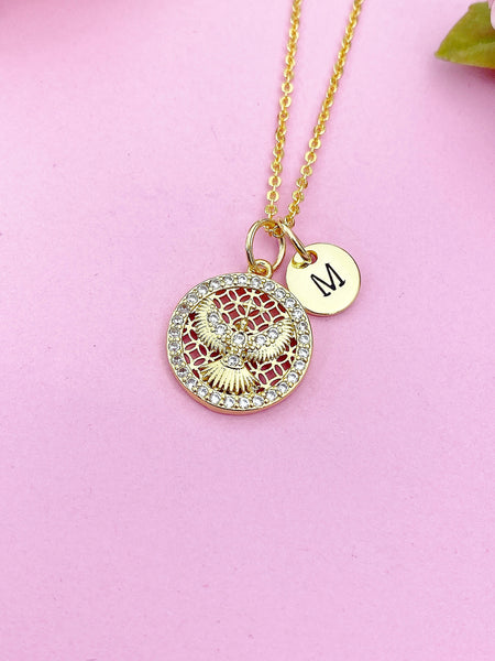This is a gold-tone Holy Spirit Dove Cross charm with hand stamped initial charm on brass or stainless-steel chain.