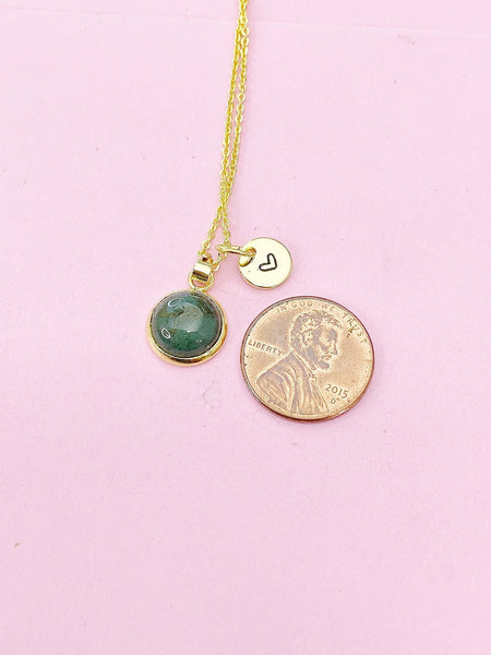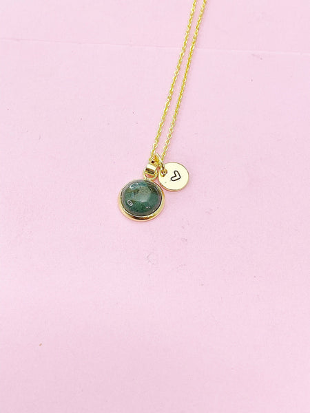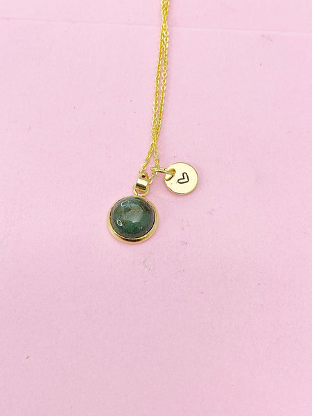 This is a gold tone natural Indian Agate charm with hand stamped initial charm on brass or stainless steel 18 inches chain.