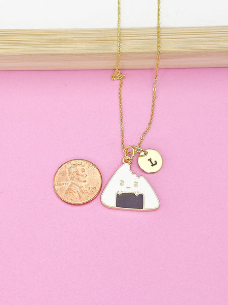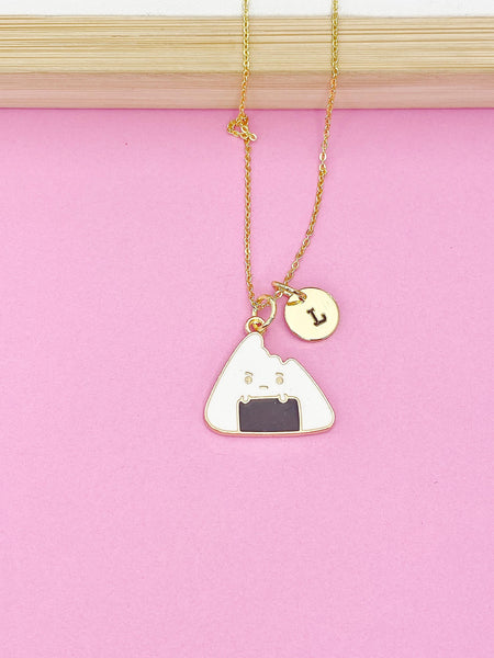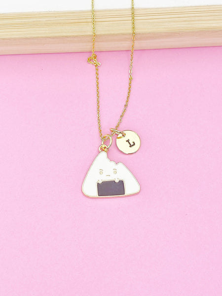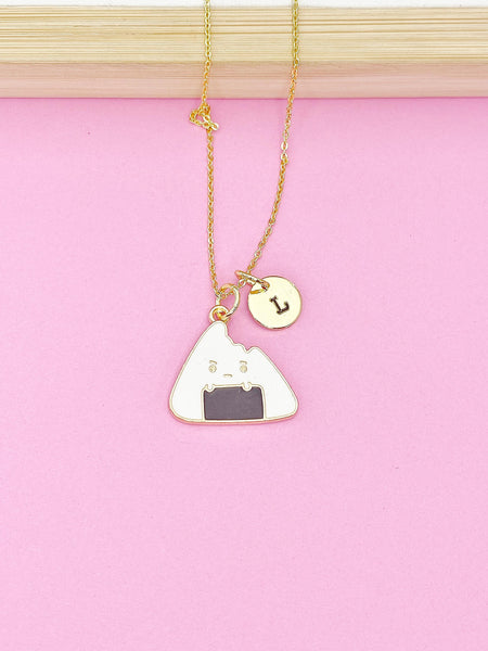 This is gold tone rice ball charm with hand stamped initial charm on brass or stainless steel 18 inches chain.