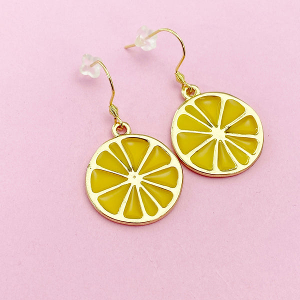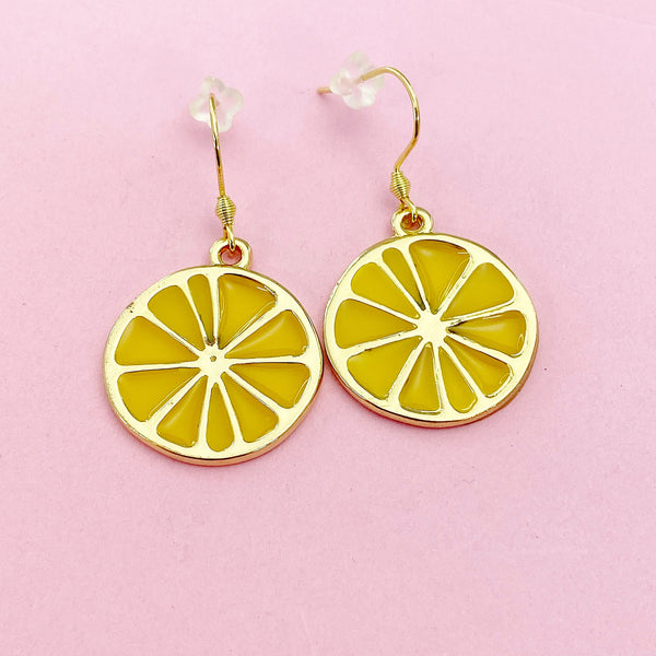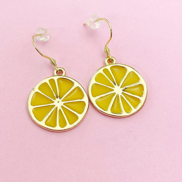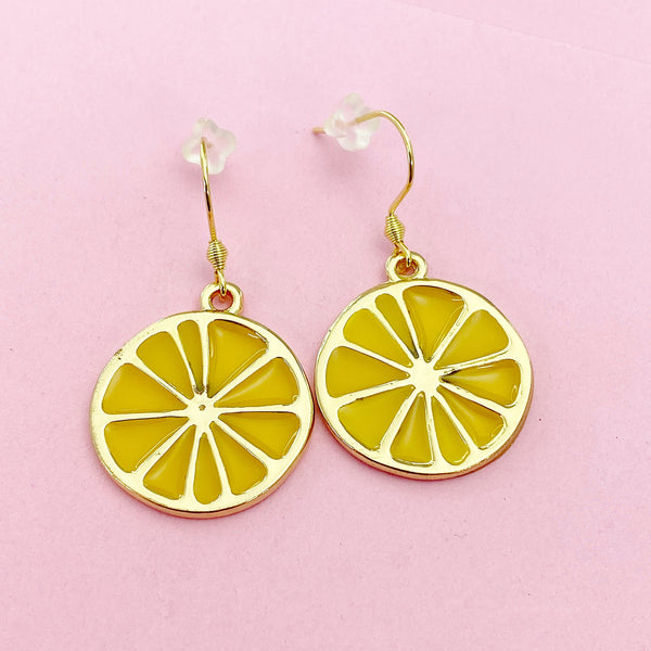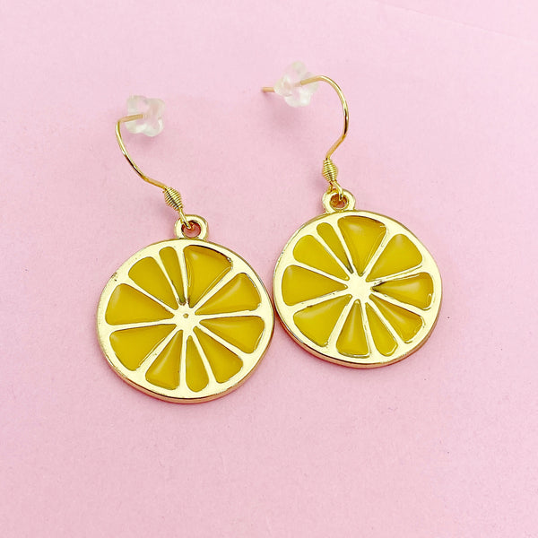 These are gold-toned lemon slice charms with stainless steel ear hooks.