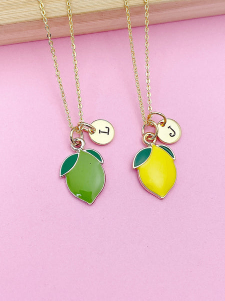 This is gold tone lemon charm with hand stamped initial charm on brass/stainless steel 18 inches chain.