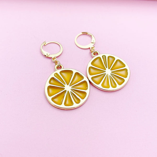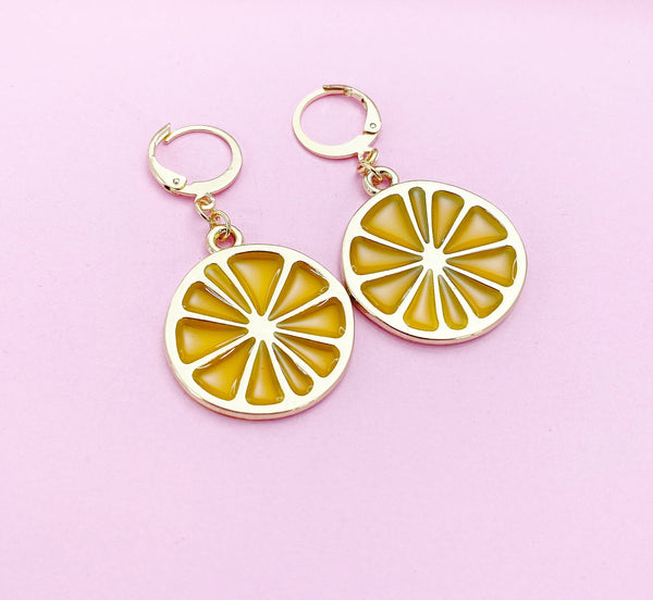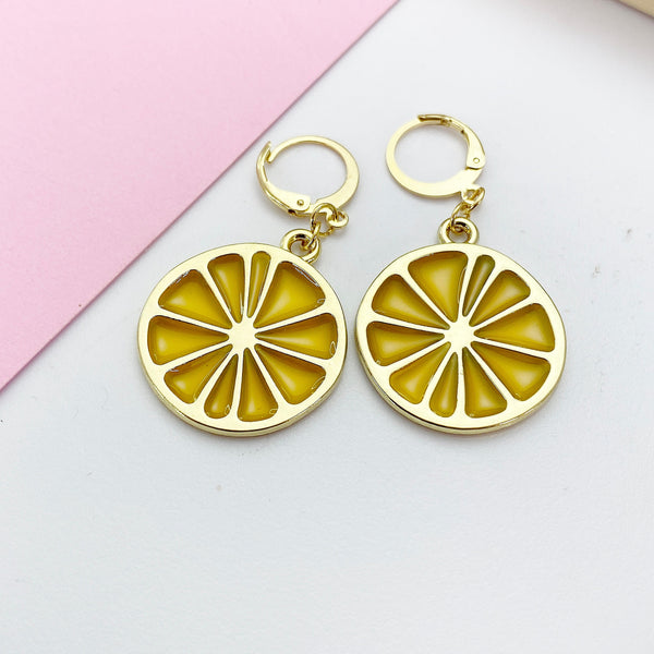 These are gold-toned Lemon Slice on stainless steel ear hooks.