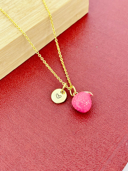 This is gold tone litchi charm with hand stamped initial charm on brass/stainless steel 18 inches chain.